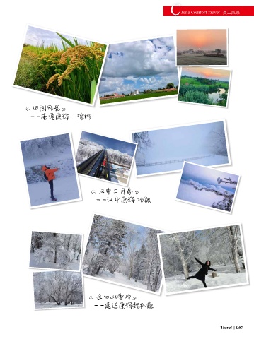 C hina Comfort Travel 员工风采 《 田园风光》 ——南通康辉 徐彬 《 汉中二月春》 ——汉中康辉 杨敏 《 长白山雪岭》 ——延边康辉魏松巍 Travel 067