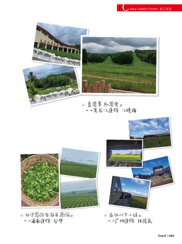 C hina Comfort Travel 员工风采 《 夏滑草 冬滑雪》 ——黑龙江康辉 汪晓梅 《白沙黎族自治县 茶园》 《长白山下小镇》 ——海南康辉 金华 ——广州康辉 林俊民 Travel 085