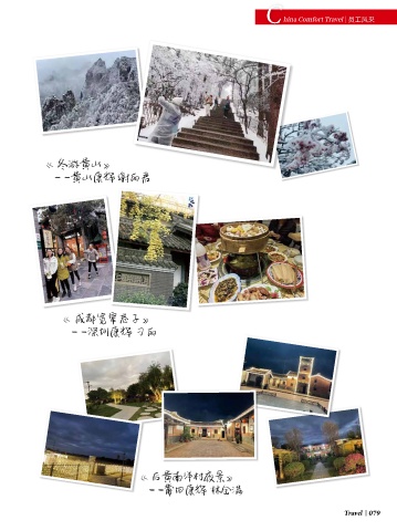 C hina Comfort Travel 员工风采 《 冬游黄山》 ——黄山康辉 谢丽君 《 成都宽窄巷子》 ——深圳康辉 刁丽 《后黄南洋村夜景》 ——莆田康辉 林金满 Travel 079