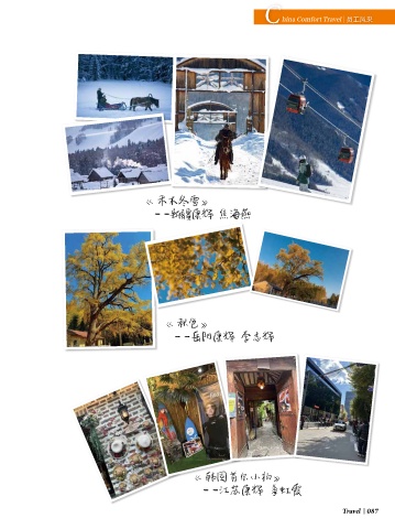 C hina Comfort Travel 员工风采 《 禾木冬雪》 ——新疆康辉 焦海燕 《 秋色》 ——岳阳康辉 李志辉 《 韩国首尔小拍》 ——江苏康辉 姜虹霞 Travel 087