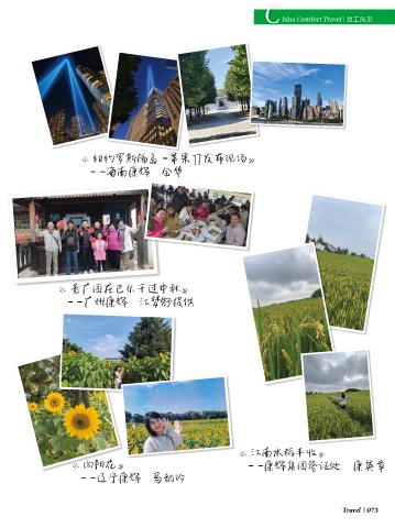 C hina Comfort Travel 员工风采 《 纽约罗斯福岛—苹果17发布现场》 ——海南康辉 金华 《 老广团在巴尔干过中秋》 ——广州康辉 江梦舒提供 《 江南水稻丰收》 《 向阳花》 ——康辉集团签证处 康英章 《 接待旅游团来宏村》 ——辽宁康辉 马韵玲 ——黄山康辉 谢丽君提供 Travel 073