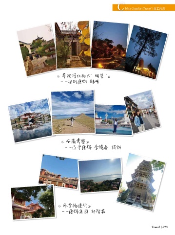 C hina Comfort Travel 员工风采 《 参观河北两大“ 明星”》 ——深圳康辉 邱峰 《 西藏考察》 ——辽宁康辉 李晓春 提供 《 冬季福建行》 ——康辉集团 祁智茹 Travel 073